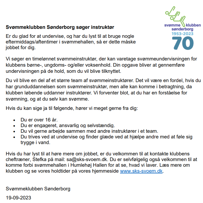 Vi ansætter løbende instruktører til svømmeskolen. Er det noget for dig, så kig gerne på vores stillingsopslag: svømmeskoleinstruktør. Kontakt os på info@sks-svoem.dk hvis du er interesseret eller hvis du gerne vil høre mere.